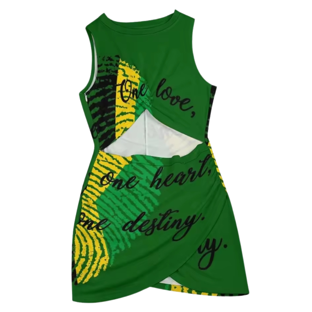 Bring the spirit of Jamaican culture, love, and island fashion into your wardrobe with this unique and stylish dress.