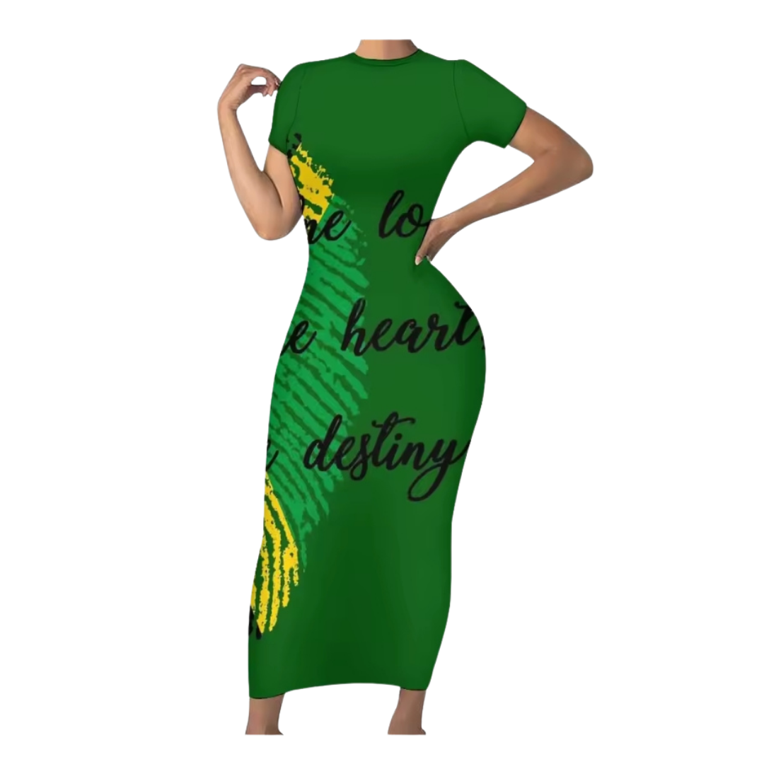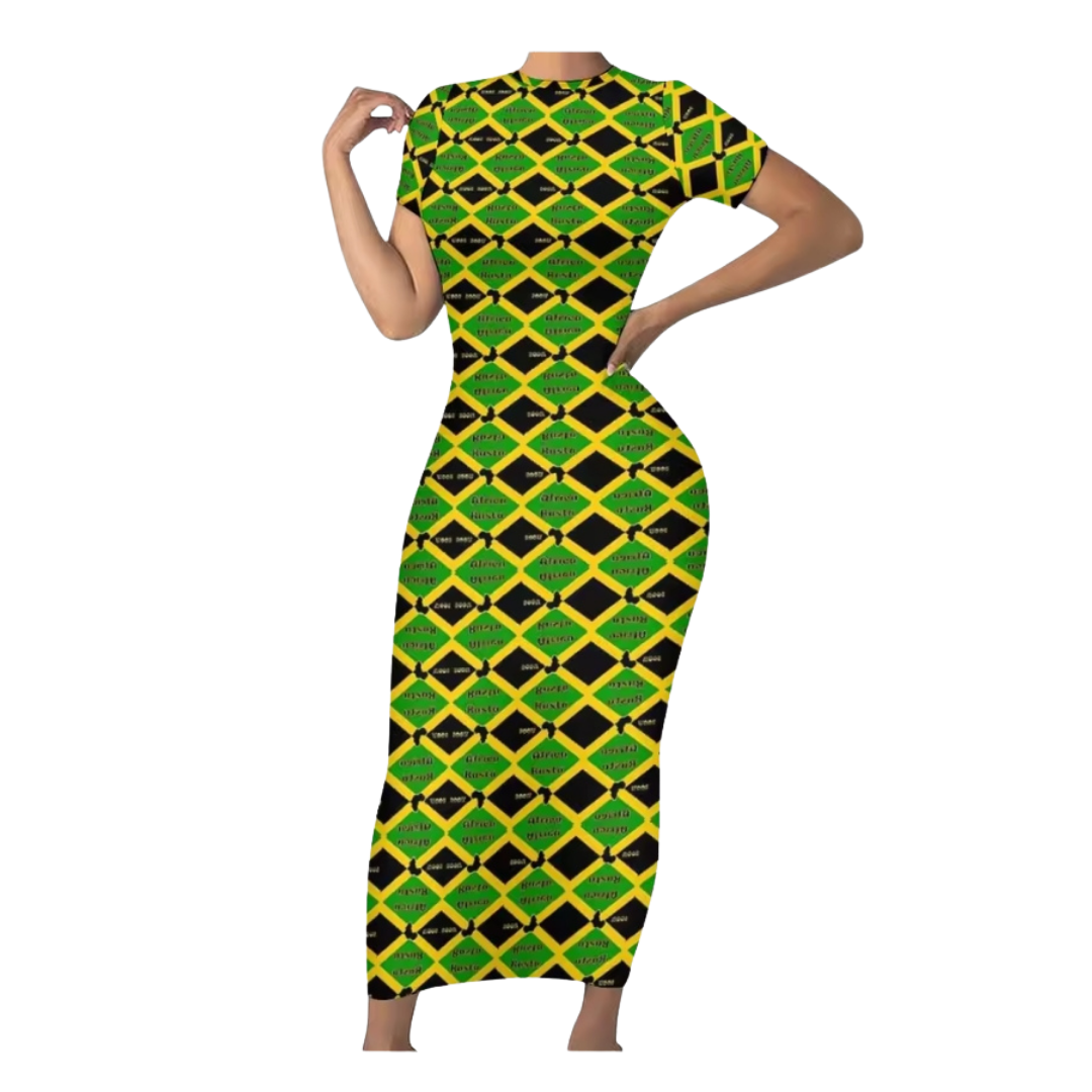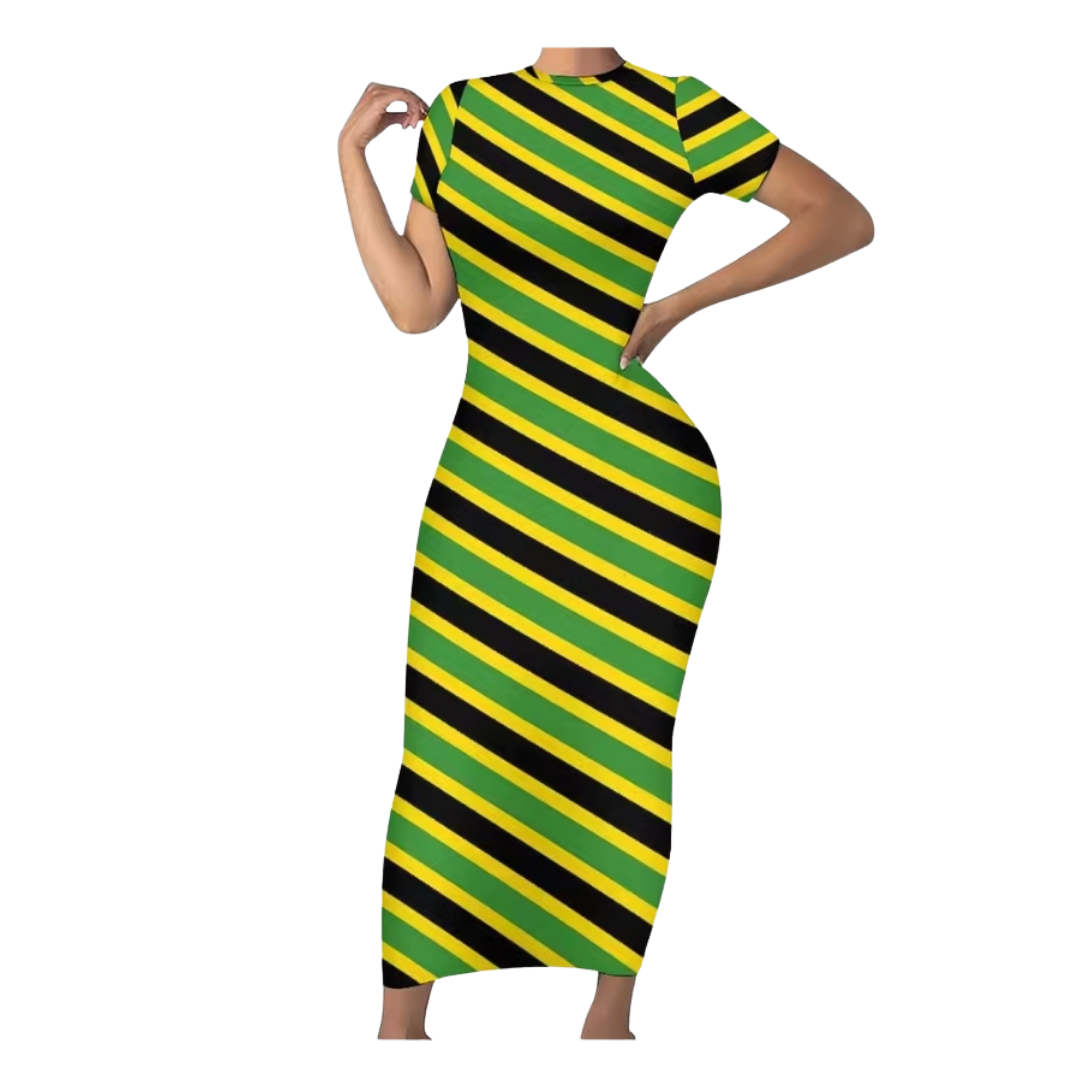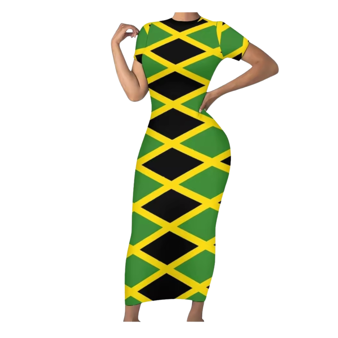 Show your love for Jamaica with this stylish Jamaican Flag Bodycon Maxi Dress, designed with the iconic green, yellow, and black flag pattern. This eye-catching dress celebrates Jamaican culture while offering a flattering and comfortable fit.